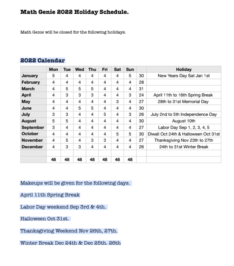 Math Genie 2022 Holiday Schedule Print
